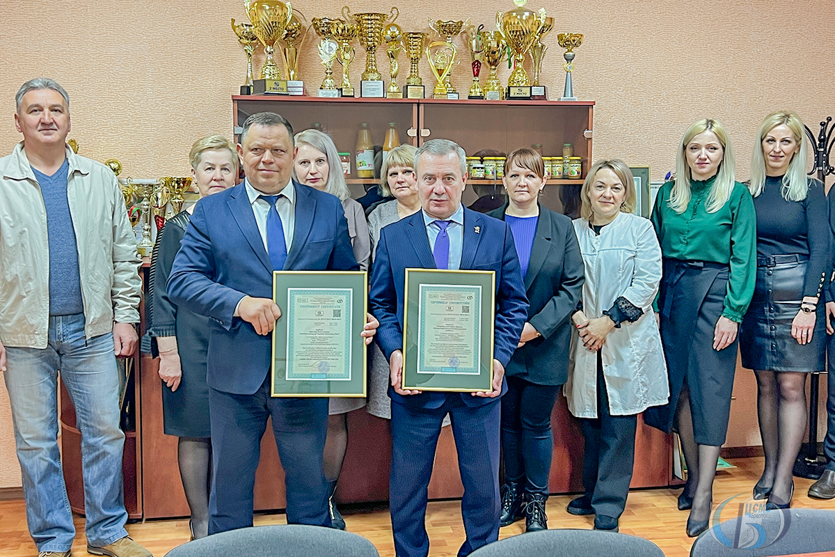 В ходе встречи директору комбината Юрию Ивановичу Витрюку вручен сертификат на соответствие требованиям СТБ ISO 37001-2020 «Системы менеджмента борьбы со взяточничеством. Требования и руководство по применению».