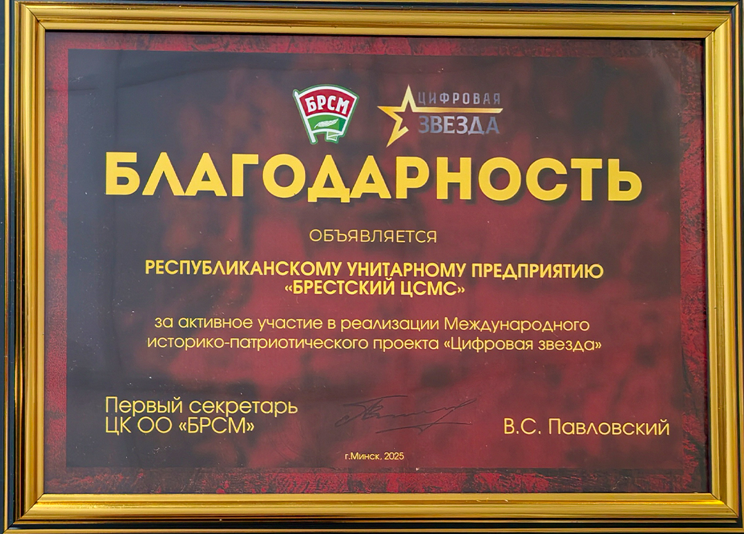 Вручена Благодарность РУП «Брестский ЦСМС» — за активное участие в реализации международного историко-патриотического проекта «Цифровая звезда».
